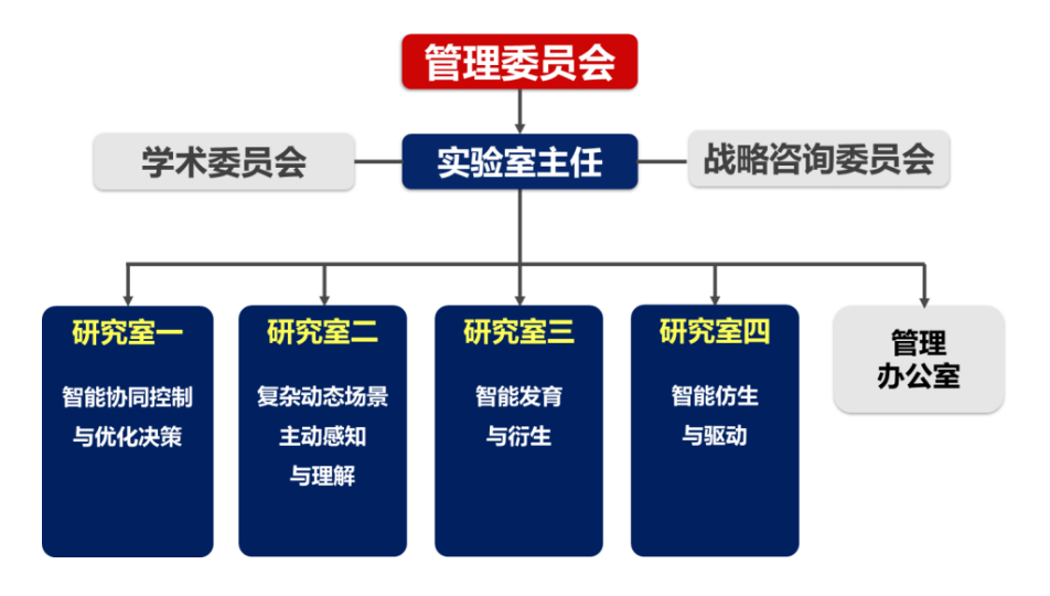 自主智能无人系统全国重点实验室依托北京成人头条、同济大学建设和运行,实行管理委员会领导下的实验室主任负责制,成立学术委员会,设立实验室管理办公室。根据研究方向,实验室设置四个研究室,各个研究室分工明确、有机结合,具备成建制、成体系、持续开展科研攻关的科研组织模式。实验室管理办公室根据职能与分工不同,分别为综合管理办公室、科研管理办公室、人事及人才培养管理办公室、财务办公室,全面负责实验室的科研管理、人才培养、外联事务、人事管理、财务管理、设备管理等。